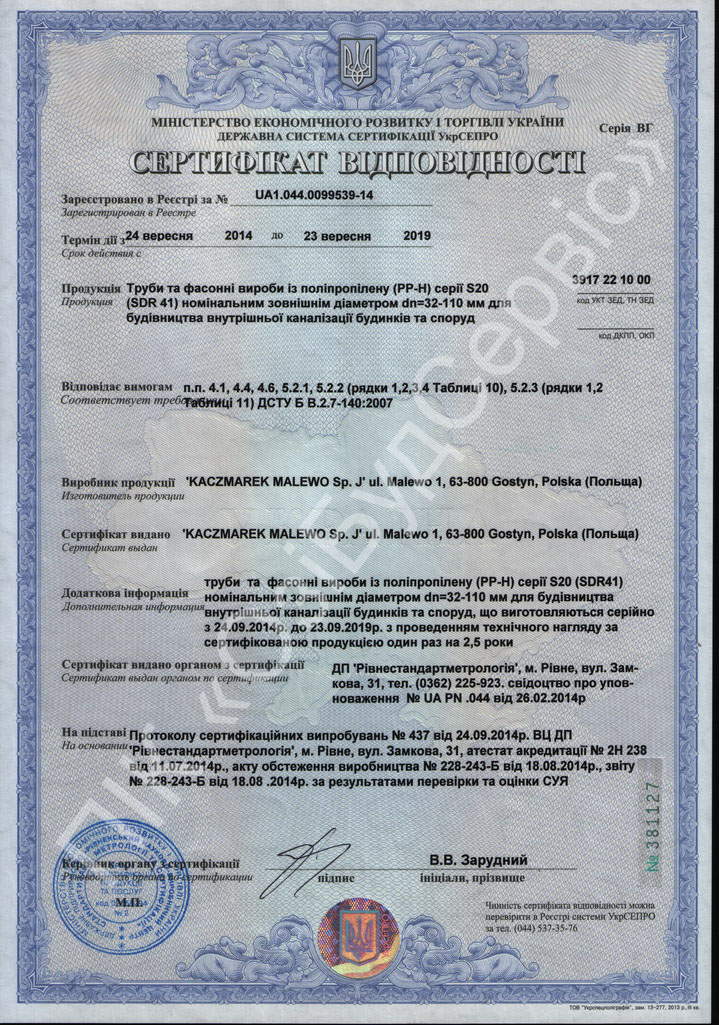 Трубы и фасонные изделия к ним для внутренней канализации из полипропилена